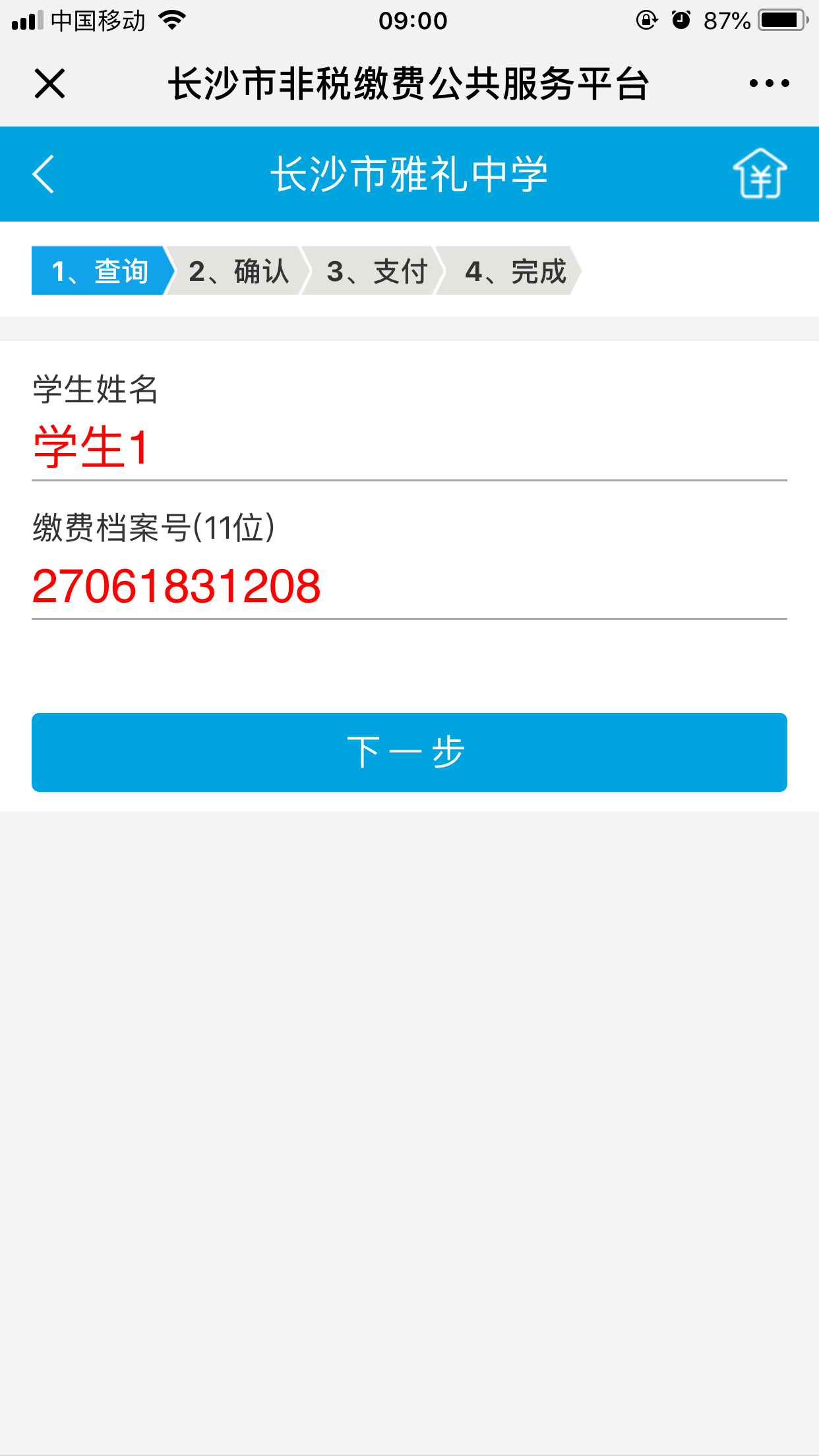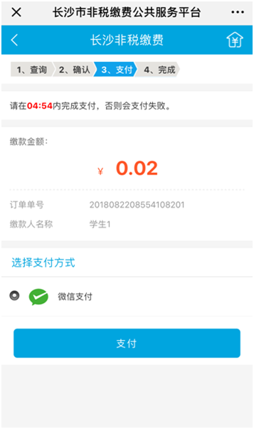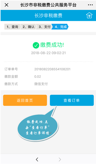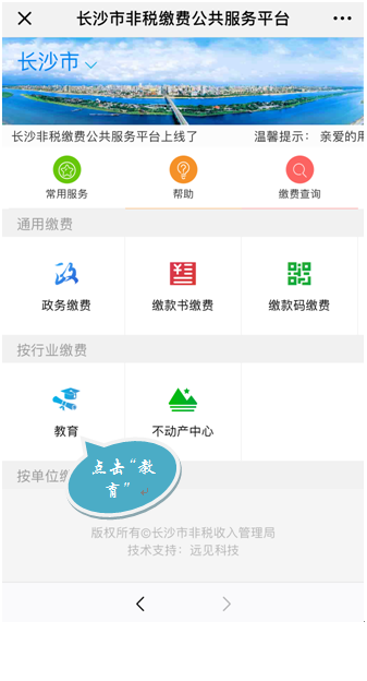 缴费时,点击“政务大厅”,选择“非税缴费”,进入到缴费主页面,选择“教育”,搜索“长沙学院”,点击“学杂费”,输入“学生姓名”和“缴费档案号(11位)”,确认缴费信息无误后,输入验证码,点击“去缴款”支付,支付成功,点击“查看订单”查看订单详情,系统实时推送缴费通知给缴款人。(见下图)