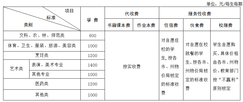1、我省大中专学校学费以招生批次为分类方式,共分为五大类,即:一本(包括“211工程”学校、列入一本招生的非“211工程”学校)、二本(指未列入一本招生的其他省属本科院校)、三本(指列入三本招生的独立学院)、高职专科院校、普通中专学校(具体收费标准见附件2、3、4、5、6)。