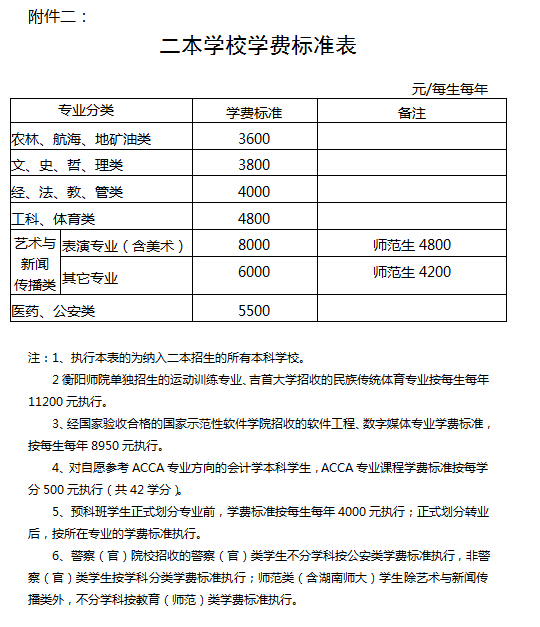 二、二本学校学费标准表