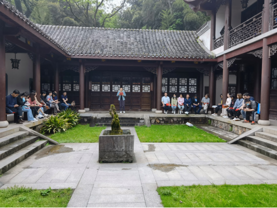 参观完岳麓书院后,党员同志们走到书院后面的屈子祠,大家兴致正浓,列队集体诵读《沁园春·长沙》和《沁园春·雪》两首词。《沁园春·长沙》是毛泽东于1925年晚秋途径长沙橘子洲所作,表现了他为改造旧中国的大无畏革命精神和壮志豪情,《沁园春·雪》是毛泽东于1936年结束长征并粉碎国民党一系列围剿后所作,表现了革命胜利后中国改天换日一片光明的新气象,发出对未来的憧憬。两首词借景抒情,大家通过诵读体会出了革命的历练,让一个“谁主沉浮”的年轻革命者,一步步走向成熟、成功,走向“风流人物”,实现个人抱负的革命家的豪迈与豁达。